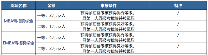 获得领袖营考核获得优秀或者良好等级考生,且第一志愿报考我校2026级MBA/EMBA并被录取,将获得相应奖学金,具体奖学金政策如下图所示。