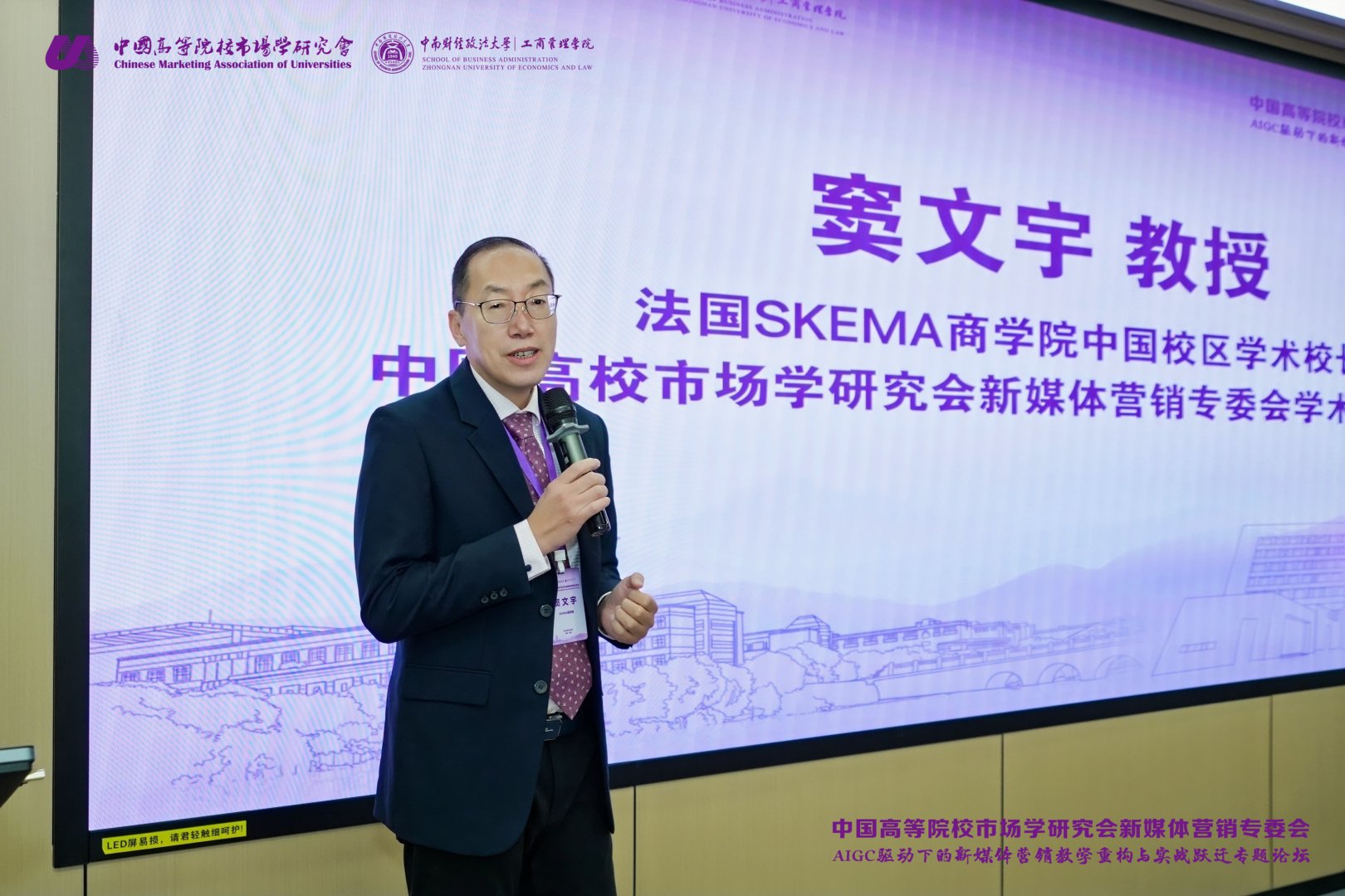 论坛开篇,法国SKEMA商学院中国校区学术校长、中国高校市场学研究会新媒体营销专委会学术委员主任窦文宇教授发表致辞。他指出,营销作为企业核心竞争力的关键构成,已完成从数字媒体营销、内容营销到AI营销的迭代升级,对前沿技术的深度吸收与实践融合,正是高质量营销的核心驱动力,为新时代营销人才培养指明了方向。